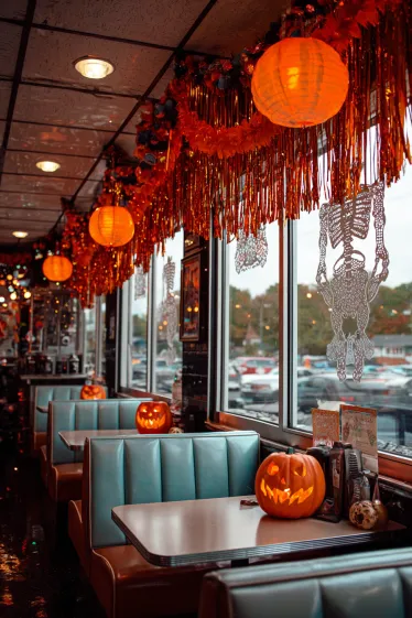 This fantastic retro diner is absolutely bursting with Halloween spirit, offering such a playful and nostalgic atmosphere! The classic booths, upholstered in a charming light blue with warm brown accents, perfectly complement the shiny chrome tables. Overhead, a dazzling display of orange tinsel garland and glowing orange paper lanterns creates a vibrant and festive ceiling. Whimsical skeleton cutouts dangle from the window frames, adding a touch of spooky fun. Each table is graced with a cheerful glowing jack-o’-lantern, making every seat feel like a special spot for a Halloween treat. It’s such a lively and inviting scene, full of vintage charm and holiday cheer.