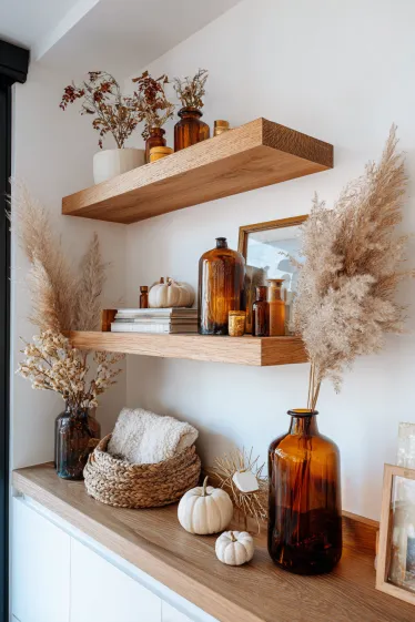 This small apartment corner keeps things simple yet stylish with earthy neutrals and natural textures. Wooden floating shelves are styled with amber glass bottles, dried florals, and soft pampas grass that instantly bring warmth to the space. A few white pumpkins are tucked in among the decor, adding that seasonal Halloween charm without overwhelming the soft, natural palette. The woven basket, framed art, and layered textures make the whole display feel cozy and perfectly suited for a small-space apartment.