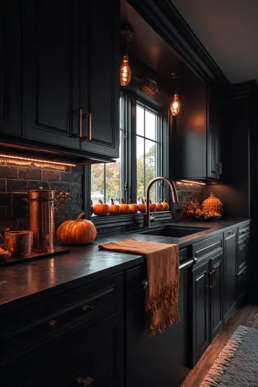 I think this design is absolutely stunning because it manages to be bold and cozy at the same time. The dark cabinetry feels chic, almost like a boutique hotel kitchen, while the pumpkins keep it fun and approachable. It’s the kind of look that makes me want to cook up something warm and comforting while enjoying that magical autumn atmosphere.
