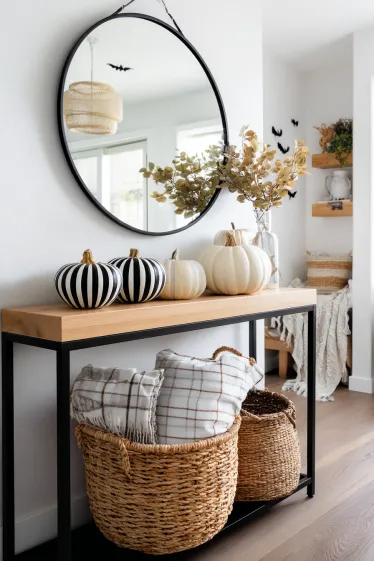 This apartment entryway shows how to make a small space look festive without any clutter. A slim wooden console with black metal legs holds a mix of white and striped pumpkins that bring a playful Halloween twist. A simple glass vase with dried leaves adds warmth, while the round mirror above reflects light and makes the space feel open. Woven baskets underneath hold cozy plaid blankets, keeping the look both practical and stylish. Small bat decals on the wall carry the theme through in a subtle way.