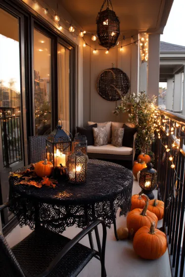 This apartment balcony is transformed into the perfect Halloween retreat. A small round table draped with a black lace tablecloth sets the stage, styled with lanterns, glowing candles, and mini pumpkins for a charming seasonal touch. String lights are wrapped around the railing and ceiling, casting a warm glow that makes the whole space feel magical. Pumpkins of different sizes are placed along the floor, while a cozy seating nook with throw pillows invites you to relax and enjoy the autumn evening.
