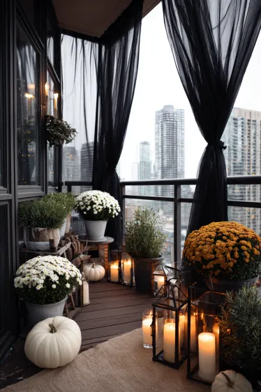 This balcony design brings a moody elegance to apartment living. Black sheer curtains frame the city skyline, instantly adding drama and privacy. Potted mums in shades of orange and white sit alongside rustic wooden crates, woven baskets, and an assortment of white pumpkins for a seasonal touch. Lanterns filled with glowing candles line the floor, casting a warm light that softens the sleek urban backdrop. The mix of textures makes the space feel cozy while still keeping that trendy Halloween edge.