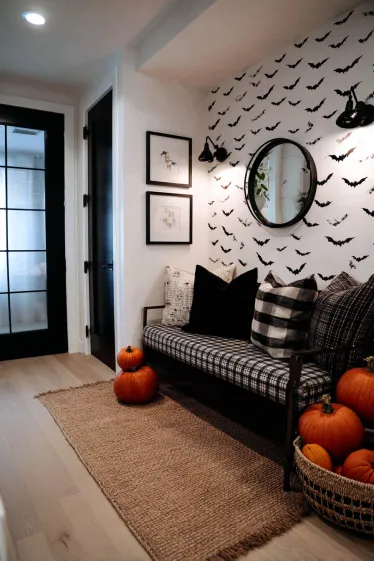 This entryway shows how to make a small space feel festive and welcoming. A cozy bench with plaid cushions and oversized pillows sits against a white wall covered in a playful bat decal design. A round mirror adds depth, while framed art and wall sconces finish the look with stylish touches. Pumpkins are scattered across the rug and tucked neatly in a basket, bringing in that warm seasonal vibe without taking up too much space.