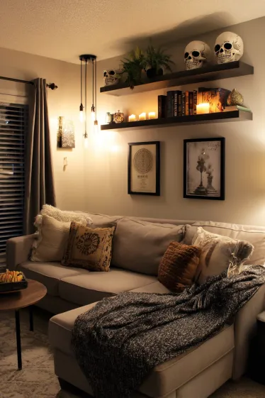 This living room creates a moody yet inviting vibe with layered textures and glowing accents. A soft sectional in neutral tones is styled with a mix of patterned pillows and a chunky knit throw, making the seating area feel extra cozy. Floating shelves above the sofa hold books, candles, and decorative skulls, while framed prints on the wall add a subtle gothic touch. Warm lighting from pendant bulbs and candlelight pulls the whole space together, casting a soft glow that feels perfect for autumn nights.