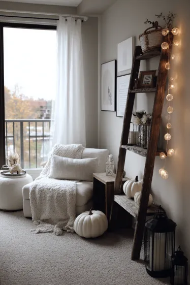 This small apartment corner feels calm and cozy while still celebrating the season. A rustic wooden ladder leans against the wall, decorated with string lights and a few white pumpkins placed neatly on the steps. A soft white chair with a knit blanket and pillow makes the perfect reading spot, while a black lantern and natural textures like wicker baskets and dried florals add warmth. The neutral palette of whites, creams, and soft wood tones keeps the look elegant and understated.