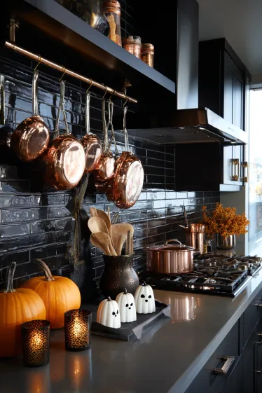 This sleek apartment kitchen uses small but impactful touches to create a festive Halloween vibe. Shiny copper cookware hangs against a glossy black subway tile backsplash, adding both warmth and style. Pumpkins are placed neatly on the counter alongside black-and-gold candleholders, while tiny ceramic ghost shakers bring in a playful touch. A copper pot on the stove and a vase of autumn florals finish the look, making the whole space feel polished yet seasonal.