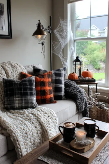This living room corner blends seasonal style with cozy textures, making it perfect for a small apartment. A soft white sofa is layered with chunky knit throws and plaid pillows in orange and black for that classic Halloween touch. A side table by the window holds pumpkins and a lantern, framed by wispy faux spiderwebs that add just the right amount of spooky flair. A wooden tray with mugs of cocoa and candles on the coffee table completes the inviting setup.