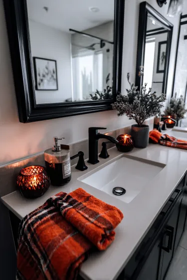 This bathroom keeps things sleek and modern while adding just the right amount of Halloween spirit. The black framed mirror and matte black faucet create a bold contrast against the white countertop. Orange plaid hand towels instantly bring a festive vibe, echoed by the glow of small amber candle holders placed neatly along the vanity. A simple vase of dried stems finishes the look, adding a natural element without overwhelming the clean design.