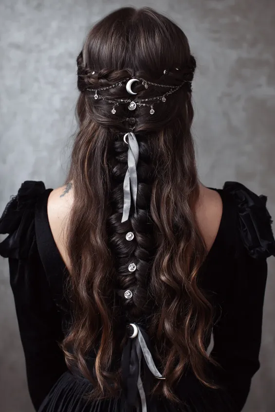 Long dark hair is styled into a half-up braid, decorated with silver ribbon, chains, and crescent moon charms. The soft waves paired with celestial details make this look dreamy and mystical.