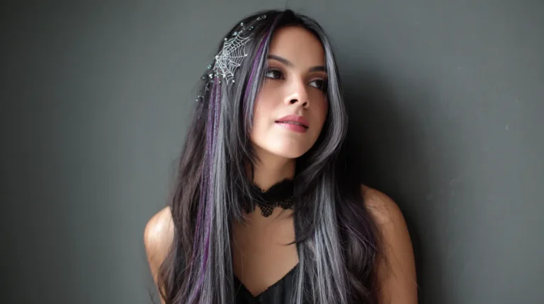 I think this look is stunning because it gives major gothic queen energy while still being wearable. The silver streaks add that perfect Halloween flair without feeling like a costume, and the half-up style gives so much dimension and drama.