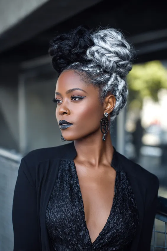 This hairstyle combines thick black and white braids twisted into a high bun for maximum impact. The contrasting colors create a bold statement while the bun shape keeps it neat and polished. The mix of textures makes it visually stunning.