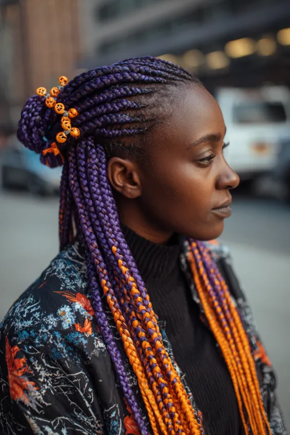 This hairstyle mixes bright purple and orange braids for the ultimate Halloween color combo. The braids are styled with small pumpkin beads that instantly add a playful, festive detail. Half of the braids are tied into a bun while the rest flow down, giving the style both structure and movement.