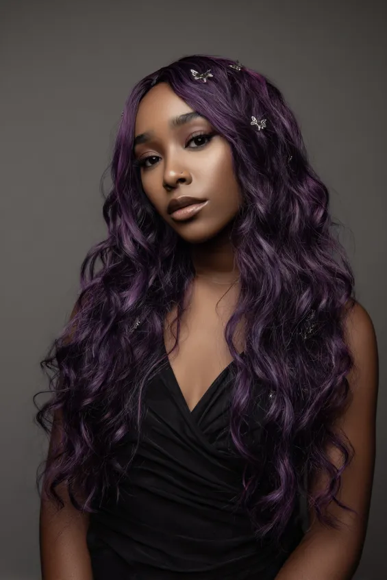 This style channels old-school Hollywood glam with structured waves that roll back gracefully. The deep black base is enhanced by purple highlights that peek through, giving it a moody, Halloween-ready twist. The volume at the front adds drama and elegance.