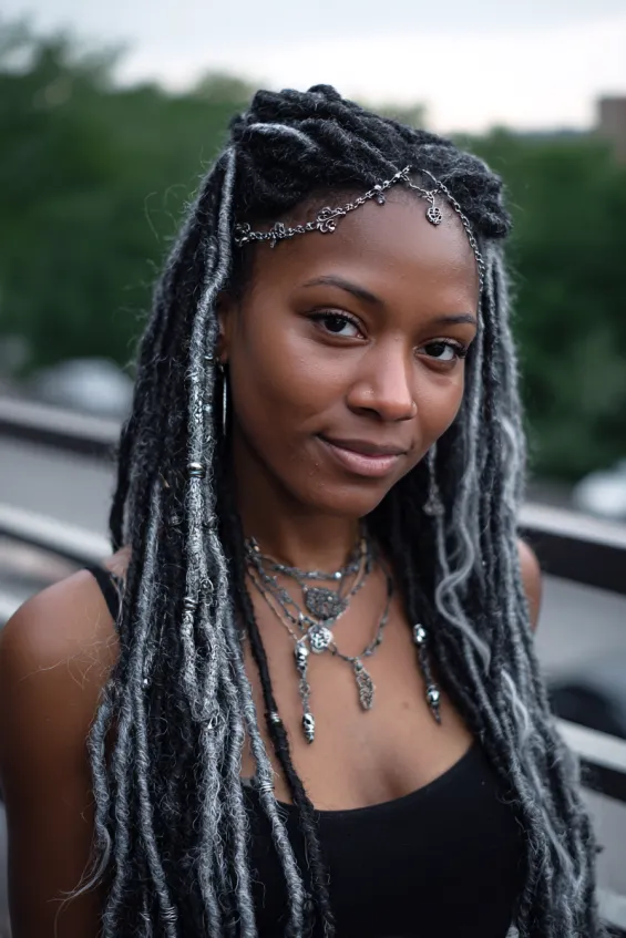 This hairstyle features long dreadlocks with silver highlights running through black strands, creating a smoky, ghostly effect. Chains and charms are woven in, giving it a gothic, enchanted vibe that feels perfect for Halloween nights.