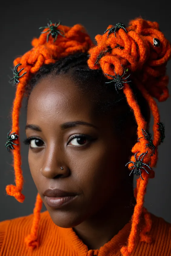 This hairstyle is bold and playful with bright orange locs styled into two high buns. Plastic spider clips are scattered throughout, making it festive and fun. The locs also hang down in tendrils for a dramatic finish.
