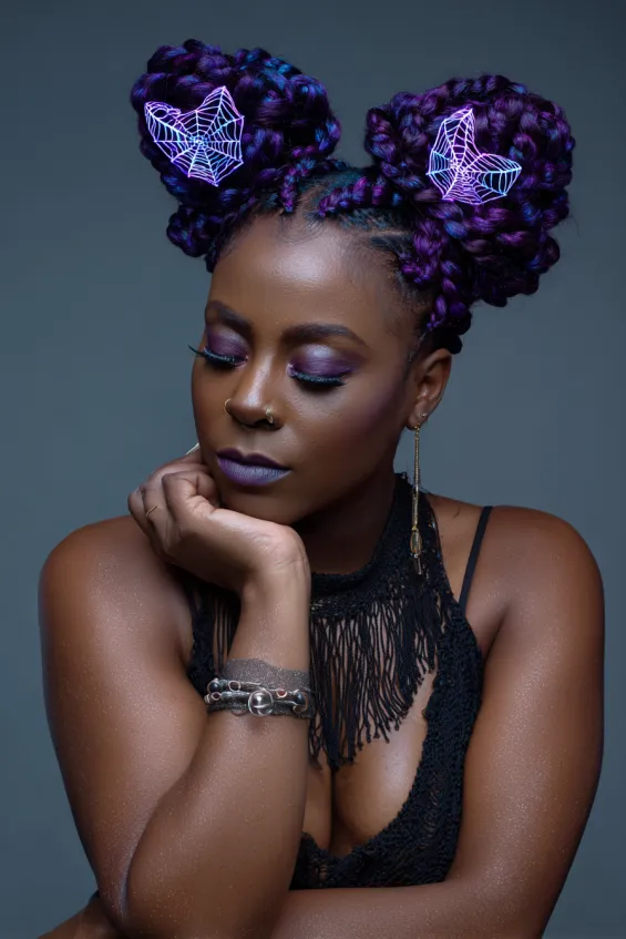 This hairstyle is bold and playful with chunky braids styled into two large space buns. Each bun is decorated with glowing spider web accents that make the whole look scream Halloween chic. The braids themselves have hints of purple and blue woven in, which makes the style even more striking.
