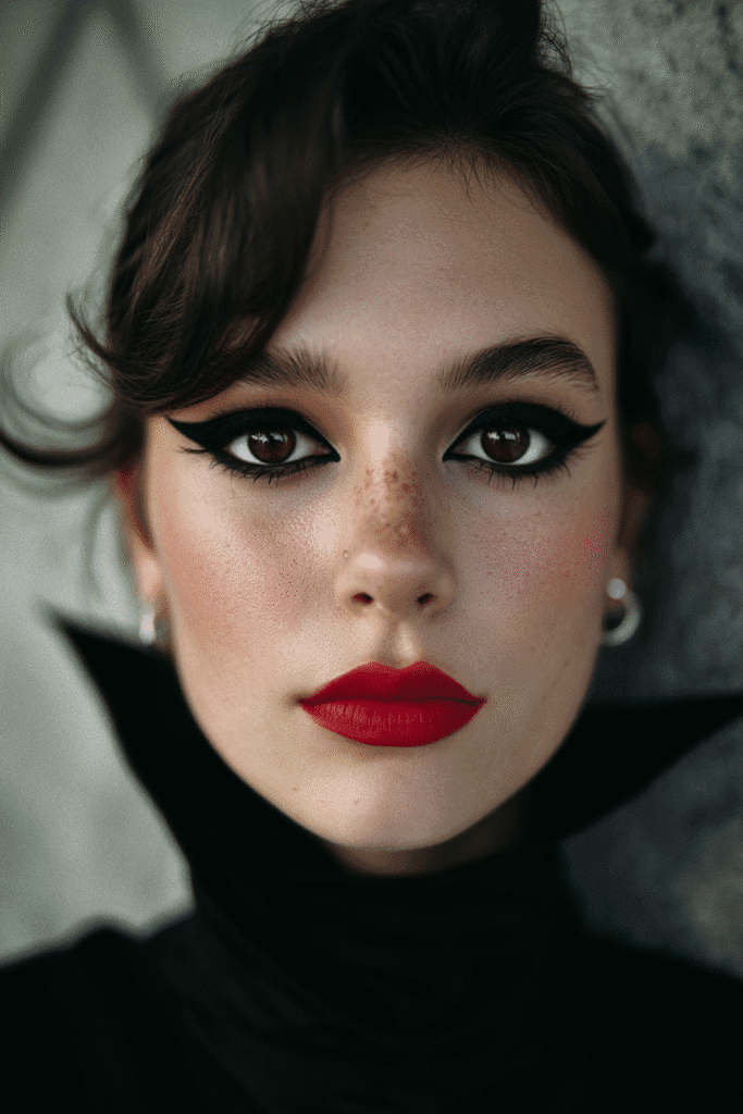 I am seriously captivated by this look it’s so edgy and artistic! The way that graphic black eyeliner just pops against the natural skin is amazing, and it immediately makes me think of a cool jester or a modern harlequin. That bold, true red lipstick is the perfect complement, adding a touch of classic glamour to the avant-garde eye design. If you’re into stepping outside the box and trying something truly unique for Halloween, this look is an absolute winner. It’s fresh, it’s bold, and it shows off your creative side in the most stunning way!