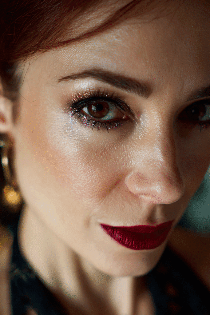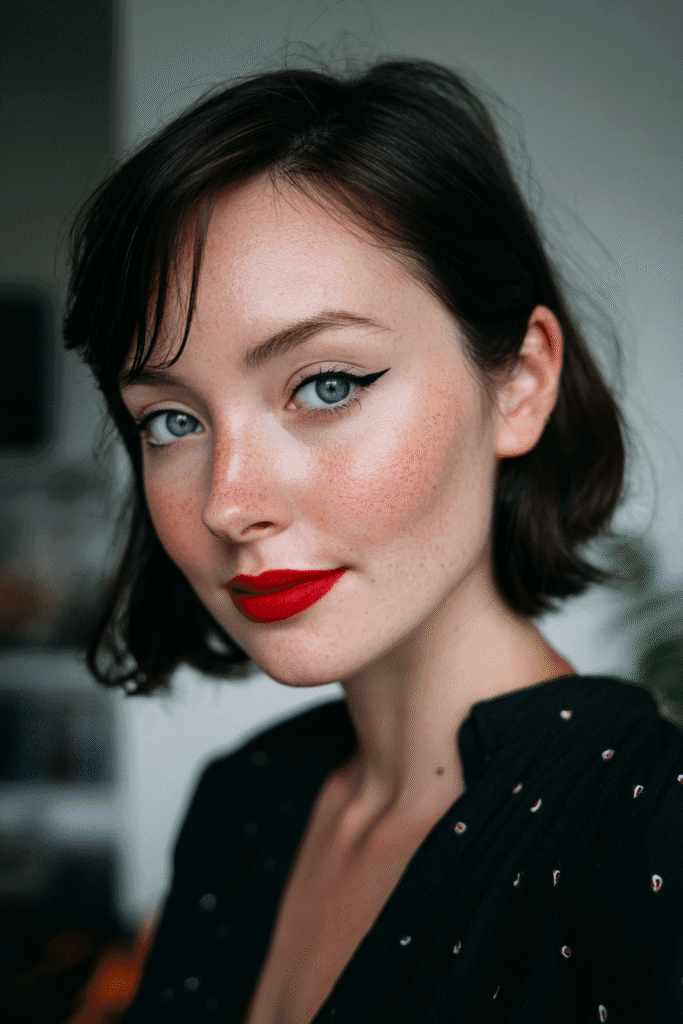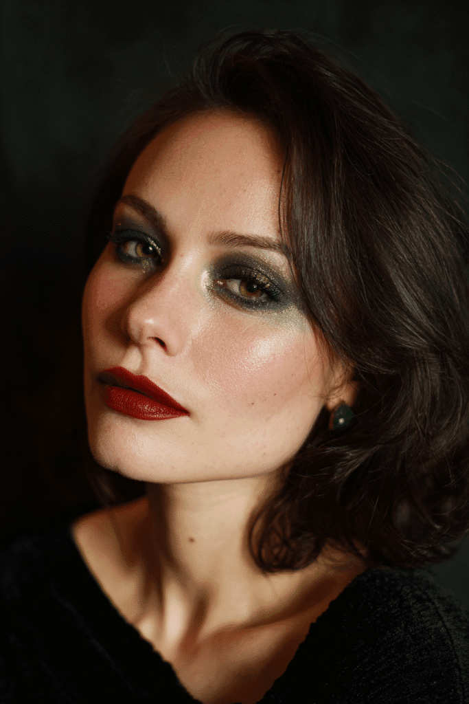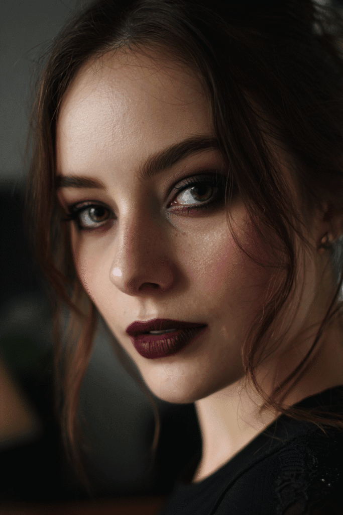 I’m completely obsessed with this whole mood it just screams classic screen siren! That dark, wine-stained red lipstick is unbelievably elegant and adds such an intense, captivating depth perfect for a mysterious Halloween character. No matter your style, this makeup works beautifully because the face is so perfectly sculpted and polished, letting the lip color truly shine. I love that it’s dramatic without being complicated, making it a fantastic, high-impact option using a darker shade of red you probably already own.