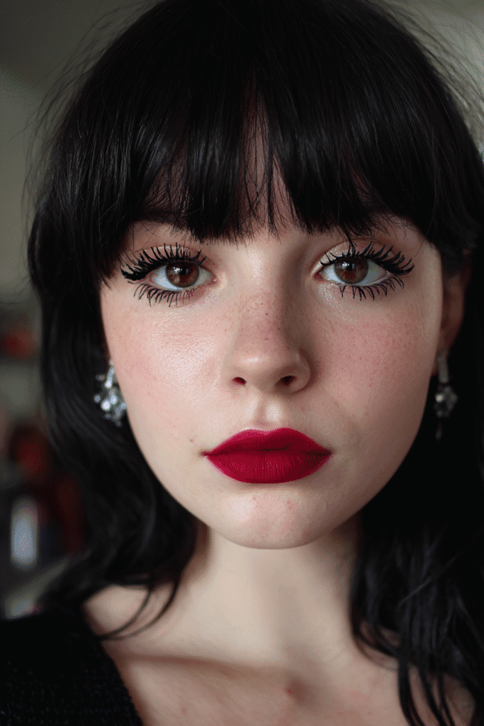 I think this look is absolutely charming and so fun for a simple yet recognizable costume! I love how the drama is focused entirely on those amazing spidery lashes—it’s a nod to a vintage style but feels totally fresh. That stunning, rich red lipstick provides the perfect pop of color and sophistication, balancing out the playful eyes. No matter your style, this is such a clean, bold way to use your favorite deep red and create an instantly iconic look without needing any complicated face paint. It’s simple, gorgeous, and wonderfully dramatic!