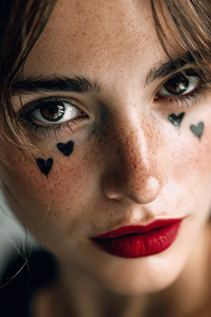 This makeup look is a playful and charming take on a classic theme, blending soft beauty with graphic elements. The skin looks fresh and natural with a dewy finish and a dusting of gorgeous freckles, enhanced by a beautiful flush of rosy blush. The eyes are made captivating with minimal makeup, focusing on curled lashes and a subtle shimmer. The most eye-catching part is the face art, featuring perfectly painted black heart shapes beneath each eye, giving a whimsical and slightly melancholic touch. The lips feature a stunning, vivid matte red lipstick, providing a bold, luxurious pout. The brows are softly defined and natural looking, letting the art elements shine.