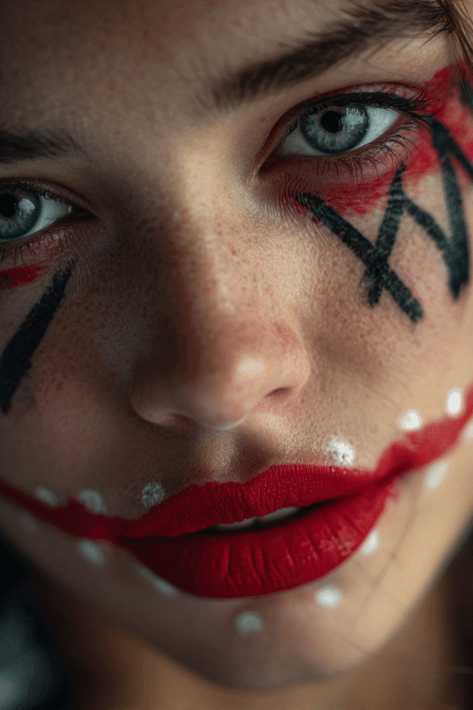 Oh my gosh, I absolutely love how classic yet totally spooky this clown makeup is for Halloween! That super wide, painted red smile is just iconic and instantly transforms your whole face into something wonderfully wicked. It’s so much fun to play with a character that can be both playful and genuinely creepy, all thanks to some clever makeup. If you’re into looks that are a little bit unsettling but still a total blast to create, this is definitely one to try. Plus, it’s a perfect way to use a really bright red lipstick and get super creative with it!
