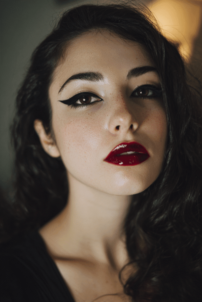 I’m totally obsessed with how luxurious and alluring this look is—it’s vampire chic for a modern age! That intensely glossy, deep red lip is absolutely breathtaking and makes such a bold, effortless statement for Halloween. If you’re into looks that are super glam but still embrace the dark, spooky side of the holiday, this is your perfect match. The sharp winged liner just adds that extra edge of fierceness. It’s the ideal way to rock a dark red lipstick and feel instantly confident and mysterious!