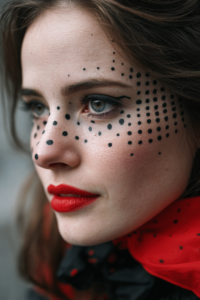I absolutely adore how clever and stylish this cheetah print idea is! It’s the perfect blend of costume fun and genuine beauty. The way those perfectly placed black dots create an animal-inspired mask without needing a full-face paint job is pure genius. That vibrant, classic red lipstick makes the whole look pop and feel so polished. If you’re into a costume that is fierce, feminine, and shows off your artistic side with a little eyeliner magic, you have to try this. It’s chic, easy to customize, and seriously stunning!