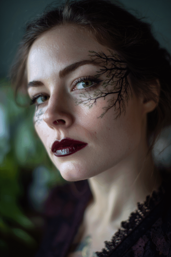I’m completely obsessed with how magically elegant this look is—it’s like a gorgeous forest spirit or a dark fairy came to life! The way those tiny tree branches are painted around the eye is seriously stunning and so incredibly unique for a costume. That glossy, vampy red lipstick adds the perfect touch of sophisticated drama, making the whole look feel luxurious and a little mysterious. If you’re into a Halloween costume that’s more beautiful and artistic than scary, this is your winner. It’s a fresh, bold way to use a dark red shade and show off your creative side!