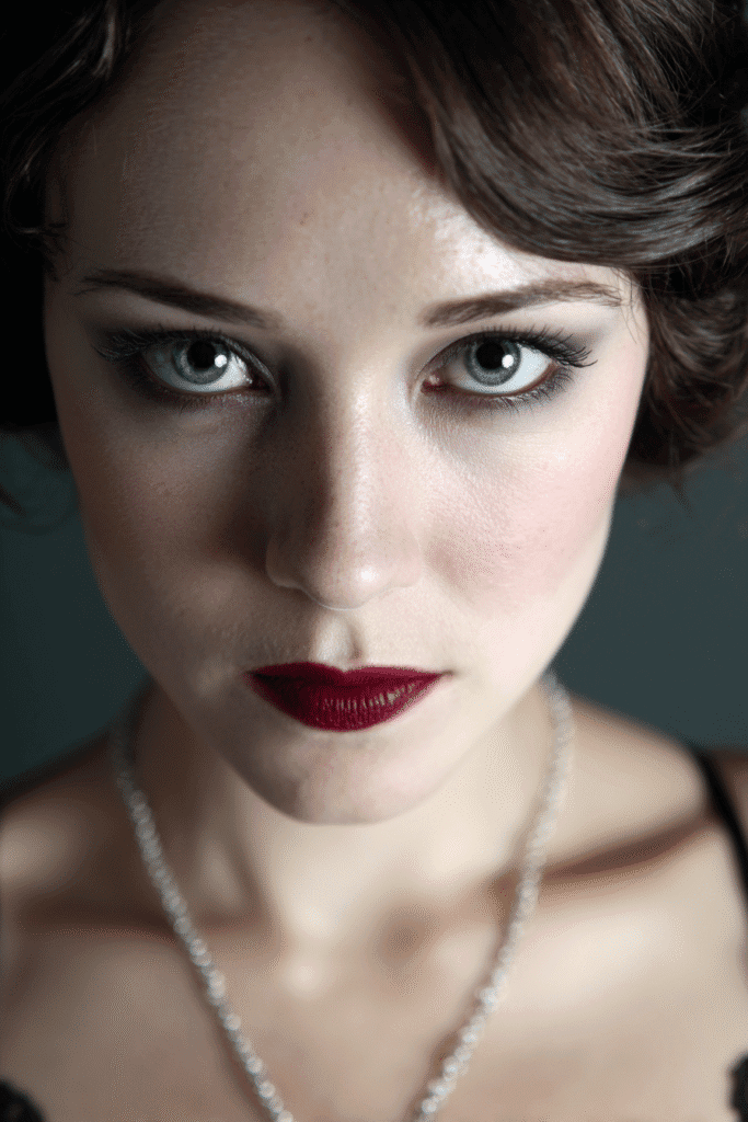 This look is a beautiful blend of vintage charm and modern drama. The skin is kept pale and luminous, creating an ethereal canvas with a touch of rosy blush placed high on the cheeks. The eyes are the star with a very smoky, smudged effect using deep grey and black eyeshadow all around the lid and lower lash line, giving a slightly dramatic, sunken appearance that’s signature for a 1920s look. The lips feature a rich, vampy deep berry red lipstick with a soft matte finish shaped into a classic cupid’s bow. The brows are gently shaped and softly defined, keeping the focus squarely on the eyes and lips.