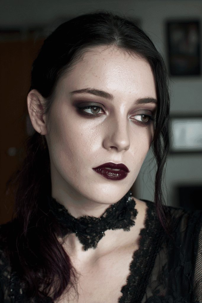 I am seriously obsessed with how effortlessly chic and wonderfully melancholic this look is! That perfectly blended, moody purple smokey eye is just breathtaking and feels so much more artistic than plain black. The way it pairs with the almost black vampy red lipstick is the definition of goth glamour and it makes me feel instantly mysterious and intriguing. If you’re into a darker, more elegant costume for Halloween, this look is absolutely stunning. It proves you can be dramatically spooky while still looking incredibly sophisticated and put-together.