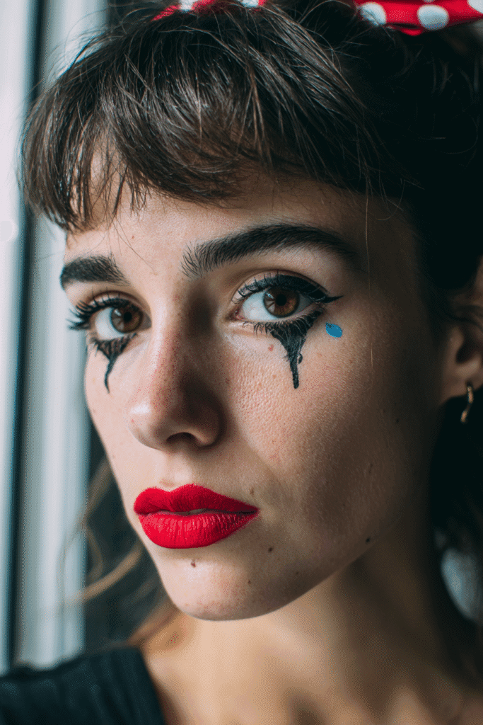 I think this crying doll or Pierrot-inspired look is absolutely adorable and such a creative way to use makeup for Halloween! I love how simple yet incredibly effective those painted tears are—they immediately convey a character without needing a lot of complicated steps. That gorgeous, classic red lipstick provides such a perfect pop of color and really ties the whole dramatic yet sweet vibe together. If you’re into looks that tell a story and are a little bit playful, this is definitely one to try. It’s fresh, unique, and lets your favorite red shade shine in a totally fun way!