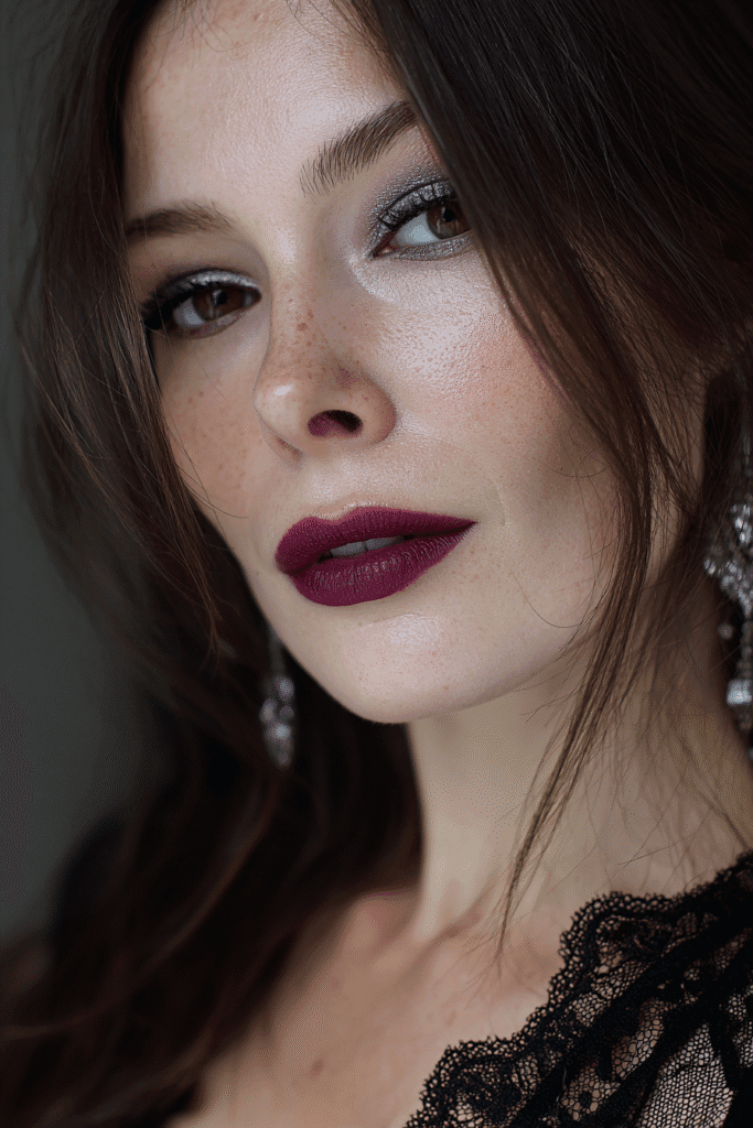 This look is a luxurious and seductive blend of cool tones and deep drama, perfect for a chic gothic costume. The skin has a luminous, healthy finish with subtle contouring and a soft, diffused blush on the cheeks, letting natural freckles peek through. The eyes are captivating with a beautifully blended smokey effect using shades of shimmering mauve, plum, and silver, concentrated on the lid and lower lash line for intense depth. A bright inner corner highlight adds a touch of light. The lips feature a rich, velvety deep berry or plum red lipstick with a satin finish, creating a beautifully vampy pout. The brows are perfectly sculpted and defined, balancing the intense eye makeup.