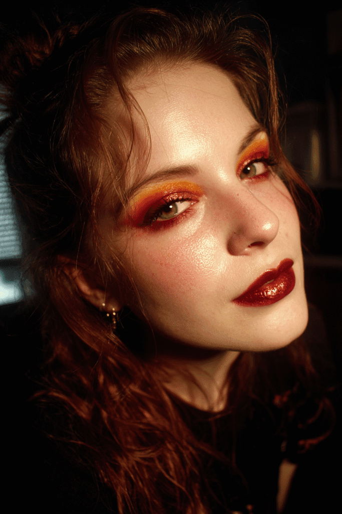 This look is a striking mix of vibrant warmth and intense depth. The skin has a gorgeous, radiant glow with dewy highlights on the high points of the face and a coordinating peachy-red blush. The eyes are the definition of drama, featuring a bold blend of bright orange and deep red eyeshadow blended seamlessly around the entire eye, mimicking a fiery glow. The lips bring in an intense, moody contrast with a high-shine deep oxblood red lipstick. The brows are kept natural but defined, providing a solid frame for the colorful eyes.
