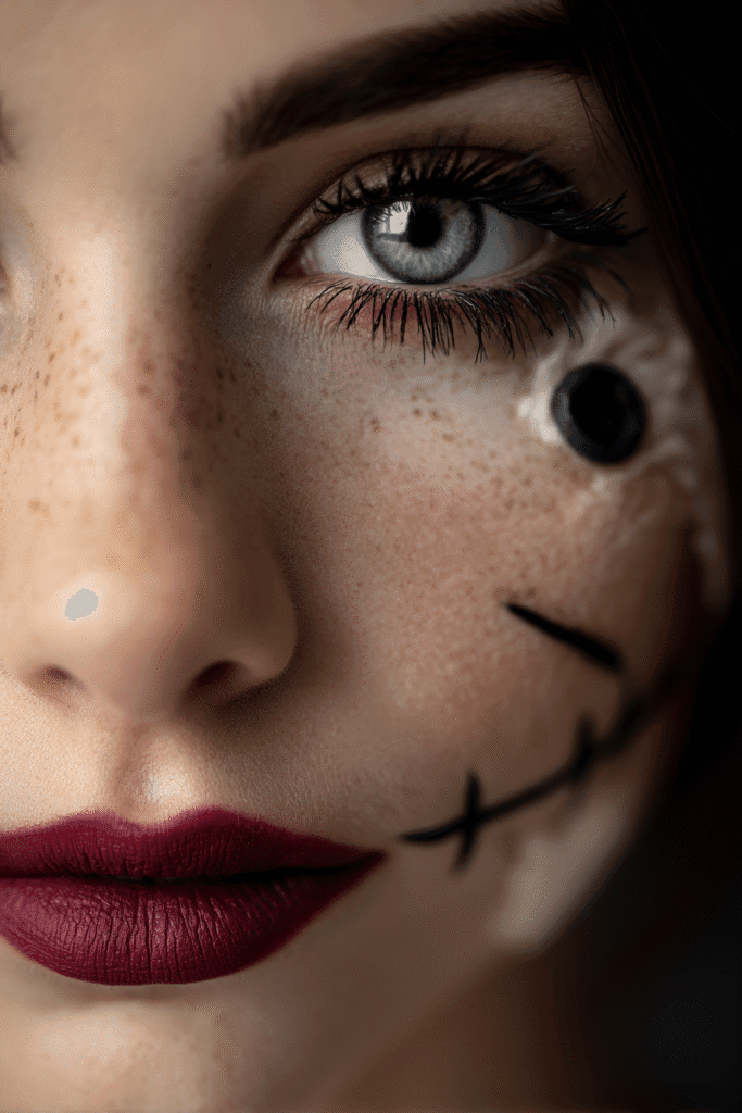 This incredibly creative look blends natural beauty with spooky artistry. The skin is kept looking naturally radiant with an abundance of lovely freckles, providing a contrast to the more theatrical elements. The eyes are captivating with a bright, almost ethereal light blue contact lens and a focus on long, spidery bottom lashes to create a wide-eyed, doll-like effect. The real magic happens on the cheek, with intricate texture work and a faux black button eye sewn onto the face, complete with painted black stitches and scars. The lips feature a rich, deep matte red lipstick in a gorgeous berry or wine shade, providing a dramatic pout. The brows are subtly defined, allowing the special effects to shine.