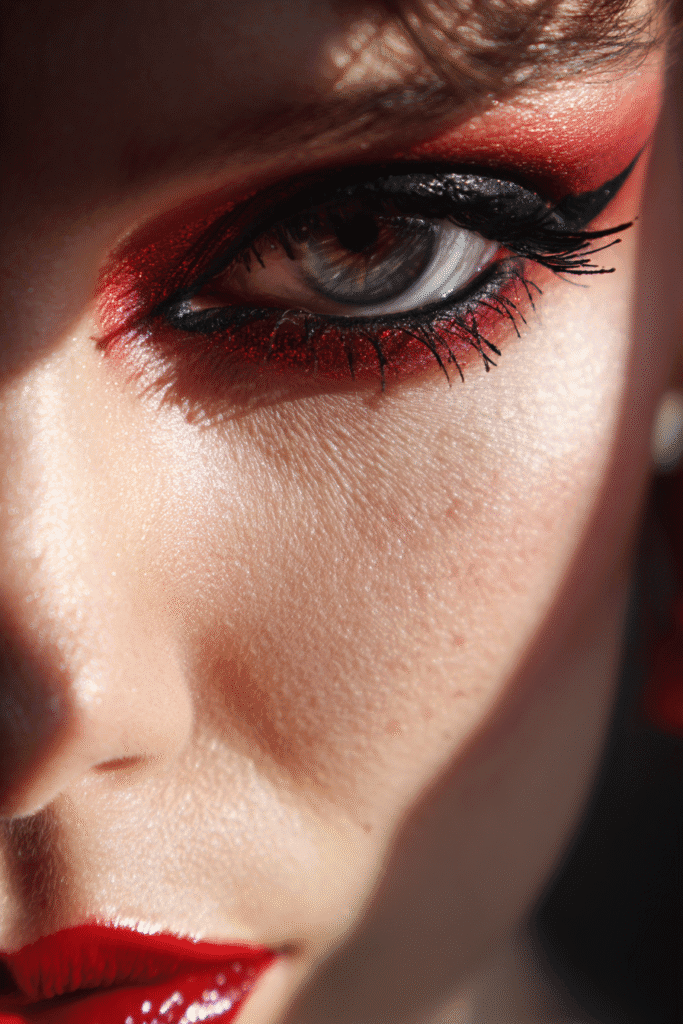 Seriously, this makeup makes me feel like a total superhero villainess or a gorgeous vampire! I am obsessed with the way the vibrant red eyeshadow is used to create such an edgy, intense smokey eye—it’s super fresh and modern. That combination of the glossy red lip and the matching red eyes is just so bold and powerful. If you’re into dramatic makeup and want a Halloween look that uses red lipstick in a totally unforgettable way, this look is your winner. It’s bold, beautiful, and absolutely demands attention!