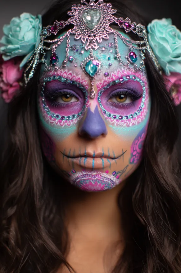 This look combines the artistry of sugar skull makeup with a glamorous twist. The face is painted in a striking palette of turquoise, purple, and pink with intricate lace-like detailing framing the eyes and mouth. Sparkling rhinestones highlight the design, giving the makeup extra dimension and shine. A jeweled tiara paired with pastel flower crowns completes the style, turning it into something magical and theatrical.