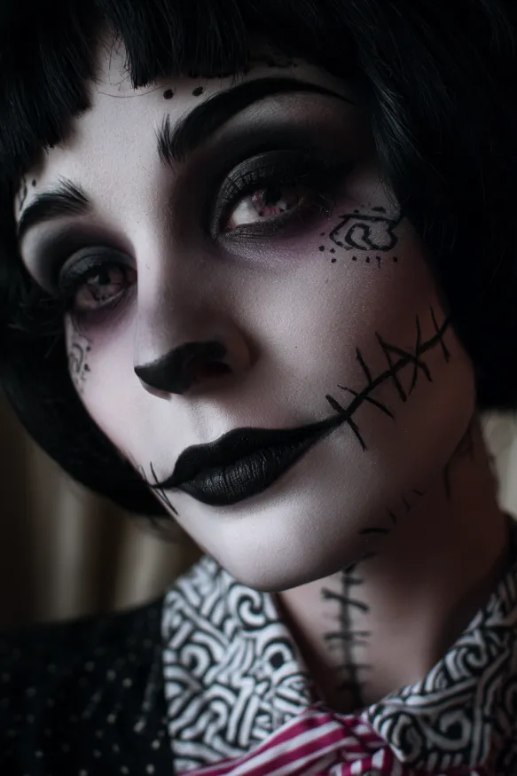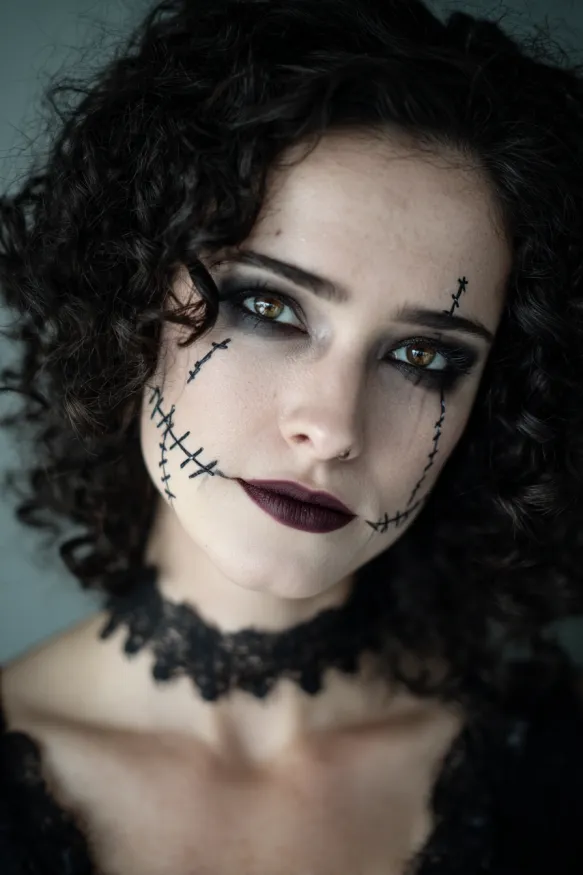 This style features haunting black stitches drawn across the cheeks and mouth, creating the illusion of a sewn-up doll face. Dark, smoky eyeshadow frames the eyes with an intense, shadowy effect, while deep burgundy lipstick enhances the dramatic mood. Her natural curls paired with a black lace choker complete the gothic-inspired vibe, making the look both eerie and captivating.
