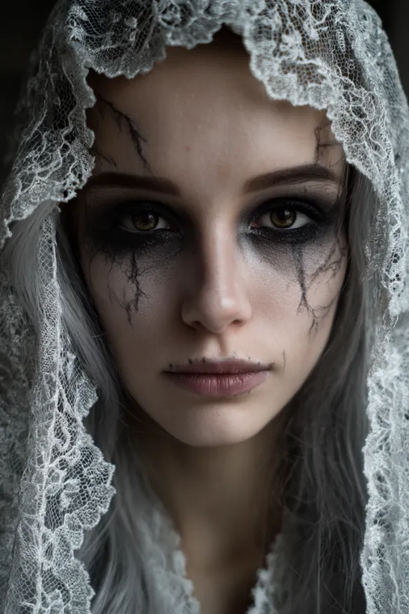 This haunting makeup pairs dark, smudged eyeshadow with delicate crack-like details that extend from the eyes and forehead, giving an eerie, broken-doll effect. The lips are muted with subtle stitch marks, while the pale complexion enhances the ghostly aura. A lace veil draped over silver hair completes the look, making her appear like a bride risen from the grave.