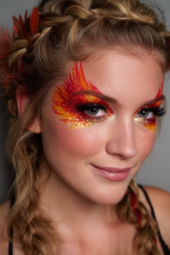 This makeup bursts with energy, featuring bold flame-like designs in red, orange, and gold extending dramatically from the eyes. Glitter highlights catch the light, giving the fiery wings a glowing effect. Paired with golden inner corners and long lashes, the eyes become the star of the look. Braided hair adorned with feathers ties into the phoenix theme, adding a mythical touch.
