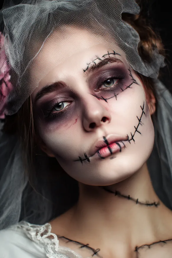 This makeup creates a chilling stitched effect with black thread-like lines drawn across the forehead, mouth, and neck. Smoky, bruised-looking eyeshadow in purples and blacks deepens the hollow-eyed appearance, adding to the undead vibe. A pale complexion paired with a delicate bridal veil contrasts beautifully with the dark makeup, giving the look a hauntingly romantic edge.