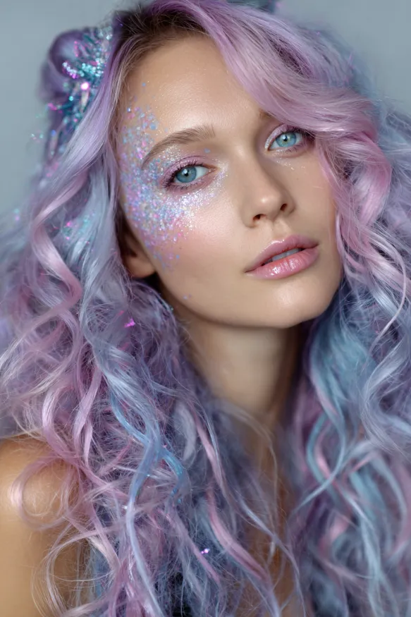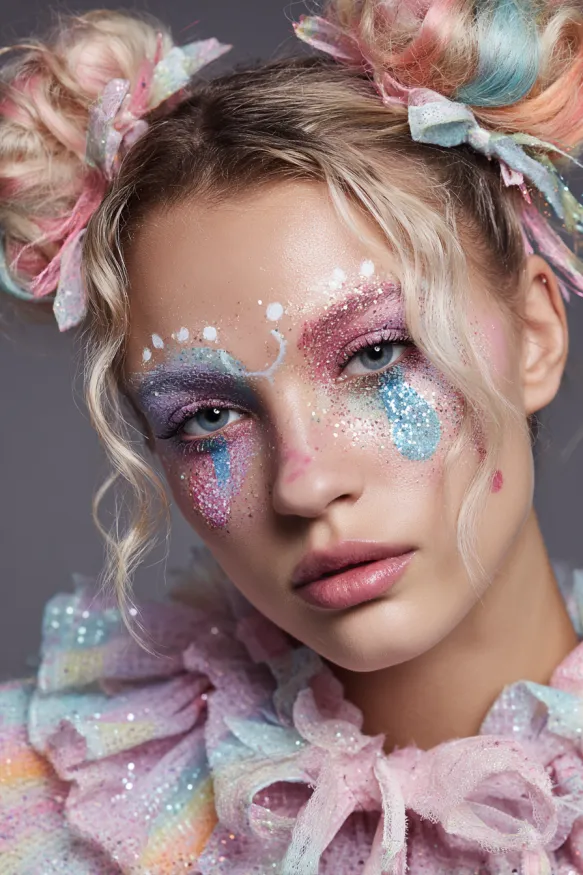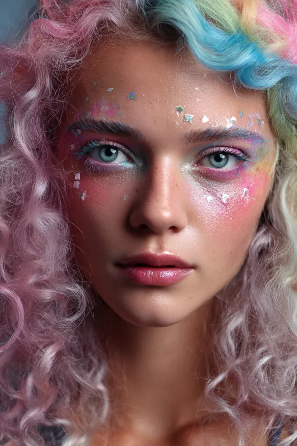 This makeup bursts with pastel magic, blending shades of pink, blue, and lavender across the eyes and cheeks. Iridescent glitter and star-shaped confetti are scattered over the skin, giving a sparkling, whimsical glow. The curly pastel hair, shifting from pink to blue, frames the face perfectly and makes the entire look feel like it belongs to a fantasy world.