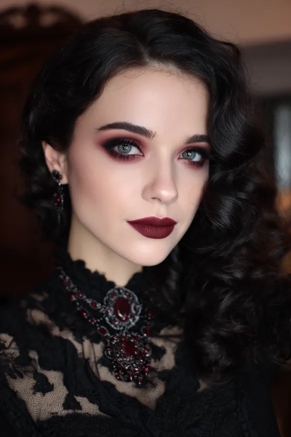This makeup radiates sophistication with rich burgundy eyeshadow blended into a smoky finish that makes the eyes pop. Deep matte wine lipstick ties everything together, creating a sultry and powerful statement. Her glossy black curls paired with ornate ruby jewelry and black lace add a regal, gothic flair that feels dramatic yet refined.