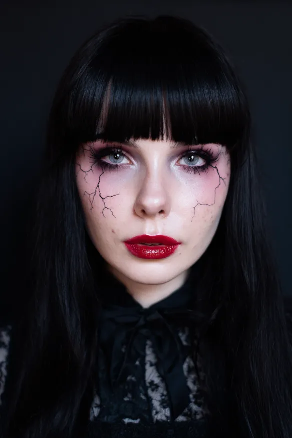 This makeup uses fine black crack lines drawn across the cheeks to mimic the look of broken porcelain. Soft pink eyeshadow paired with long lashes gives the eyes a delicate, doll-like effect, while bold red lips add a striking contrast. The jet-black straight hair with blunt bangs frames the face, enhancing the eerie porcelain vibe and making the cracks stand out even more.