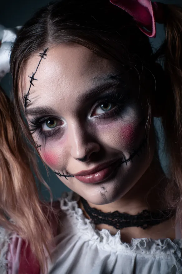 This style transforms the face into a haunted doll with dramatic black stitches drawn across the mouth and forehead. Smoky eyes with heavy lashes create a wide-eyed effect, while rosy blush circles on the cheeks add an eerie doll-like charm. Her hair is styled in playful pigtails tied with pink bows, softening the spooky look with a touch of innocence.