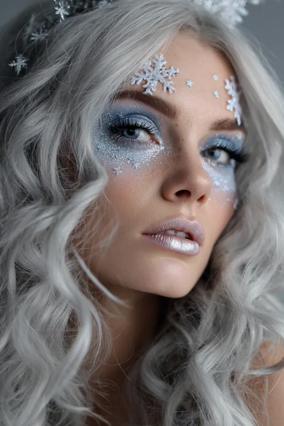 This frosty style shimmers with cool tones of blue and silver. Glittery snowflake designs frame the forehead and cheeks, while icy blue eyeshadow and frosted lips complete the wintry vibe. The long silver hair enhances the magical effect, making the entire look feel straight out of a frozen fairytale.