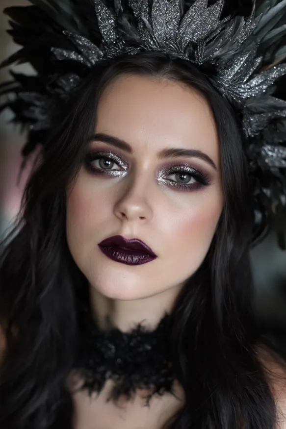 This makeup glows with drama, featuring shimmering silver eyeshadow blended with deep plum tones that create a mesmerizing smokey eye. The bold dark purple lipstick adds intensity, while flawless skin and subtle blush balance the look. A striking black feathered crown and lace choker elevate the style, giving it an otherworldly, regal edge.