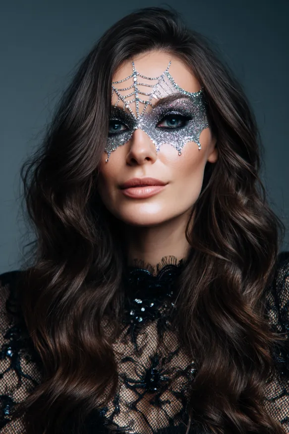 This makeup creates the illusion of a glittering spiderweb mask across the eyes. Silver glitter outlines the dramatic web design, with delicate strands extending over the forehead for an enchanting effect. Smoky eyeshadow and bold eyeliner enhance the gaze, while the rest of the face is kept soft and polished to let the web shimmer as the centerpiece. The overall style balances elegance with a playful Halloween vibe.