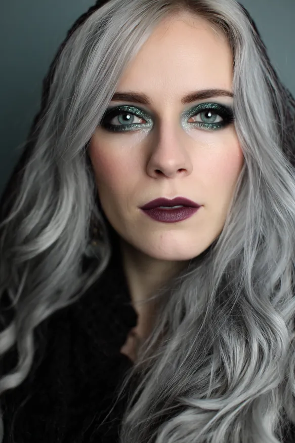 This look pairs shimmering teal eyeshadow with bold black liner, creating a striking, mystical effect around the eyes. The deep plum lipstick adds contrast and drama, while her flawless complexion keeps the focus on the vibrant eye makeup. Long silver hair flows down in soft waves, enhancing the magical, sorceress-like aura.