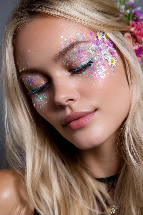 This makeup sparkles with pastel glitter scattered across the cheeks and eyelids, catching light with every movement. Tiny real flowers, including daisies and delicate purple blooms, are placed at the temples, making the look feel straight out of a magical meadow. Soft eyeliner and glossy lips keep the style fresh and youthful, while flowing blonde hair frames the whimsical design perfectly.