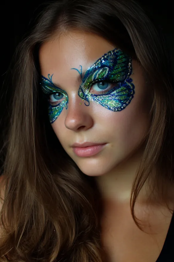 This makeup transforms the eyes into glittering butterfly wings with shades of blue, green, and hints of black creating intricate, wing-like patterns. Shimmering glitter enhances the design, making the butterfly effect look vibrant and lifelike. The rest of the face is kept natural with soft lips, allowing the detailed artwork around the eyes to shine as the focal point.